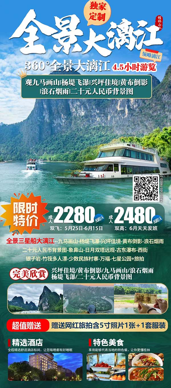 (具体开船时间由桂林旅游股份有限公司统一安排,如开船时间提起或延后敬请谅解,不在另行通知!)乘坐漓江游轮《三星船大漓江》游览百里如画大漓江(AAAAA级景区,游览约4小时),可以欣赏到大漓江——兴坪佳境、黄布倒影、九马画山、浪石烟雨、杨堤飞瀑等五大美景高潮,途中会观赏到阳朔最具特色古镇之一【兴坪古镇】您将欣赏到经典的黄布倒影、二十元人民币背景图,让您沉醉与山水之间。(温馨提示:1.擦亮眼睛,一定要选择漓江正规航线!如看不到九马画山请慎重选择哦!2.星船参考码头:水东门码头-杨堤码头/朝板山码头-磨盘山码头/磨盘山码头-水东门码头 /磨盘山码头-朝板山码头 (上下船码头以水运中心实际出票为准) 由桂林旅游股份有限公司统一提供。)